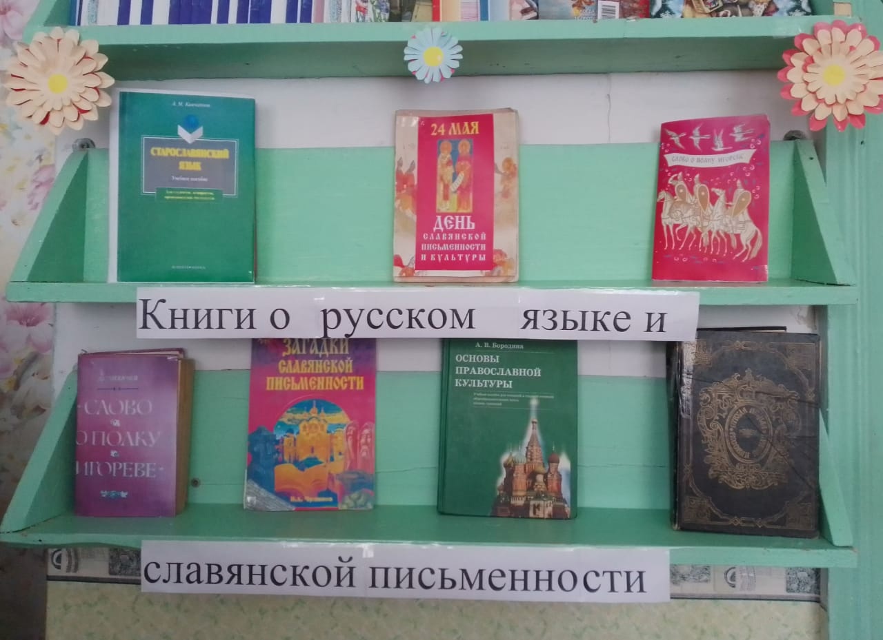 В нашей школьной библиотеке была организованна совместно с учениками выставка книг о русском языке и славянской письменности с использованием элементов славянской и русской культур.