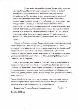 На адрес нашей школы пришло письмо от нашей коллеги, ветерана трудового фронта Тришиной (Дюндик) Татьяны Митрофановны.