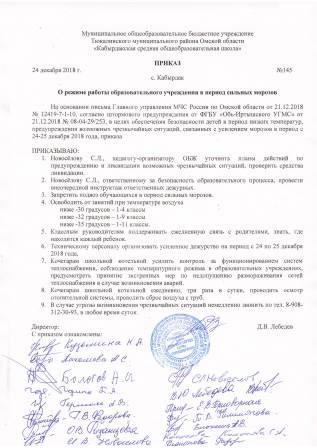 Уважаемые родители, в связи с низкой температурой воздуха, в целях безопасности детей, от занятий в школе освобождаются обучающиеся согласно приказу №145 от 24.12.2018 г.